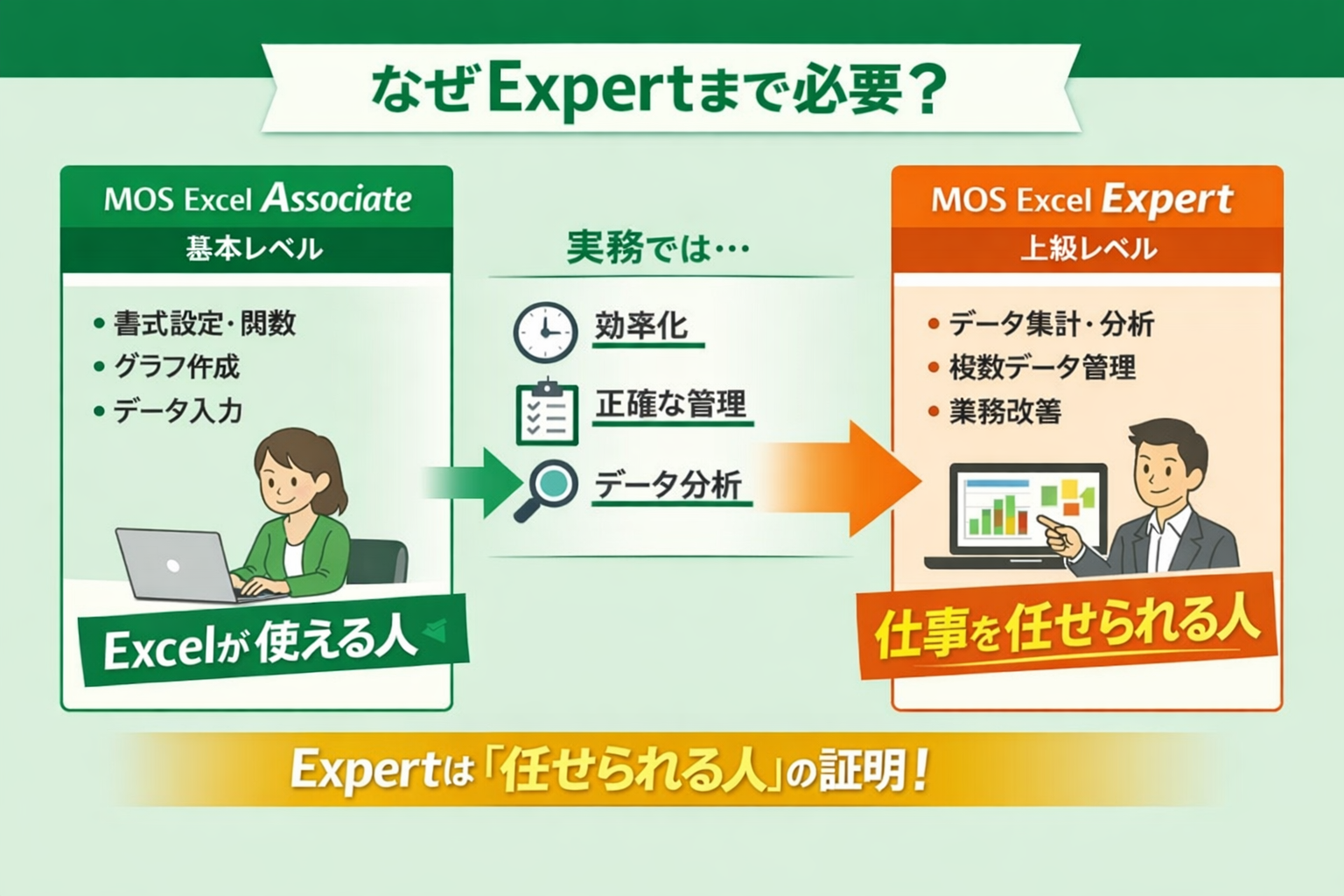 MOS Excelには、**Associate(一般)とExpert(上級)**の2つのレベルがあります。